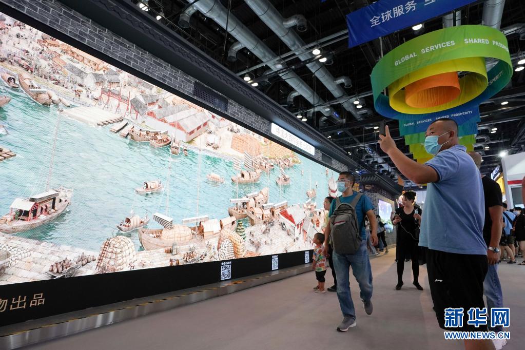 在2020年中國國際服務貿易交易會綜合展區(qū),參觀者在參觀展出的《穿越時空的大運河》數字影像(2020年9月6日攝)。新華社記者 鞠煥宗 攝