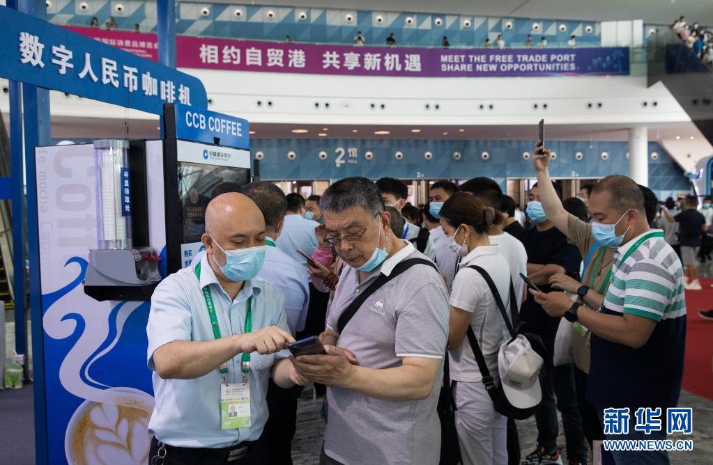 在??谂e行的首屆中國國際消費品博覽會上,參觀者體驗數字人民幣咖啡機(2021年5月10日攝)。新華社記者 金立旺 攝