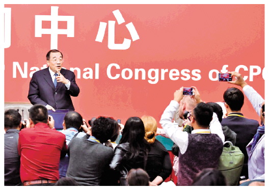 2017年10月19日,中國共產(chǎn)黨第十九次全國代表大會舉行記者招待會,請時任中央紀委副書記、監(jiān)察部部長、國家預防腐敗局局長楊曉渡等介紹加強黨建工作和全面從嚴治黨,堅定不移推進依規(guī)治黨,建設(shè)完善黨內(nèi)法規(guī)體系的情況。李鑫 攝