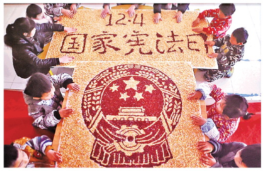 為了增強全社會的憲法意識,弘揚憲法精神,加強憲法實施,全面推進依法治國,2014年11月,全國人大常委會作出決定將12月4日設(shè)立為國家憲法日。圖為2014年12月,山東省沂源縣小朋友用玉米、紅小豆等作物制作出各種法治宣傳畫,迎接首個“國家憲法日”。 (資料圖片)