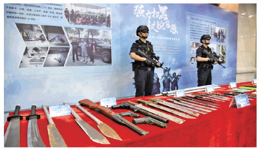 2018年1月,中共中央、國務院發(fā)布《關(guān)于開展掃黑除惡專項斗爭的通知》。三年來,全國共打掉涉黑組織3644個,黑惡犯罪得到根本遏制。圖為廣東警方查扣的涉黑涉惡團伙的涉案物品。 鄧華 攝