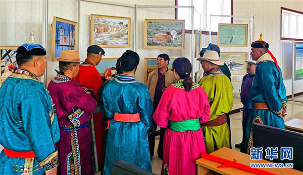 6月7日,廷·巴特爾介紹他在草場(chǎng)拍攝的野生鳥類照片。 新華社記者 恩浩 攝