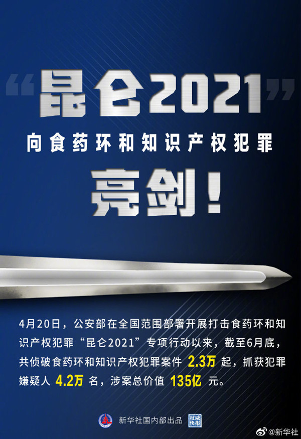 呵護(hù)“舌尖上的安全”、保障醫(yī)療用藥安全、打擊侵權(quán)假冒犯罪、打擊破壞生態(tài)環(huán)境犯罪……公安部29日召開新聞發(fā)布會介紹,公安部4月20日在全國范圍部署開展打擊食藥環(huán)和知識產(chǎn)權(quán)犯罪“昆侖2021”專項(xiàng)行動(dòng)以來,截至6月底,共偵破食藥環(huán)和知識產(chǎn)權(quán)犯罪案件2.3萬起,抓獲犯罪嫌疑人4.2萬名,涉案總價(jià)值135億元。(記者熊豐,海報(bào)設(shè)計(jì)賈伊寧)