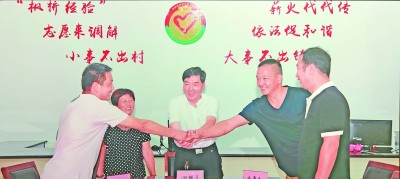 發(fā)揚(yáng)新時代“楓橋經(jīng)驗(yàn)”,運(yùn)用法治思維和法治方式化解矛盾糾紛。圖為在浙江省諸暨市楓橋鎮(zhèn)調(diào)解志愿者聯(lián)合會的調(diào)解下,當(dāng)事人握手言和。