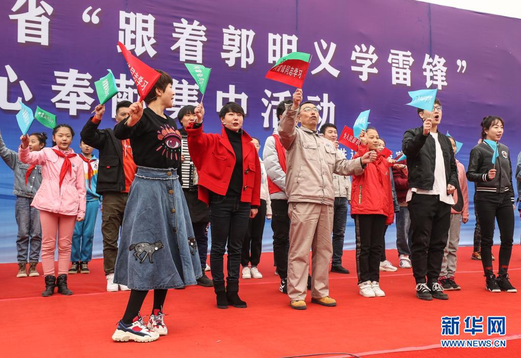2019年3月5日,在遼寧省葫蘆島市文化廣場(chǎng)舉行的遼寧省“跟著郭明義學(xué)雷鋒”愛心奉獻(xiàn)集中活動(dòng)現(xiàn)場(chǎng),郭明義(前排中)與志愿者合唱《學(xué)習(xí)雷鋒好榜樣》歌曲。新華社記者 潘昱龍 攝
