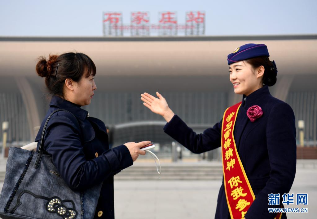 2019年3月5日,在石家莊站廣場(chǎng),中國鐵路北京局集團(tuán)有限公司京鐵列服公司石家莊分公司高鐵餐吧部的工作人員引導(dǎo)一名旅客前往候車位置。新華社記者 王曉 攝
