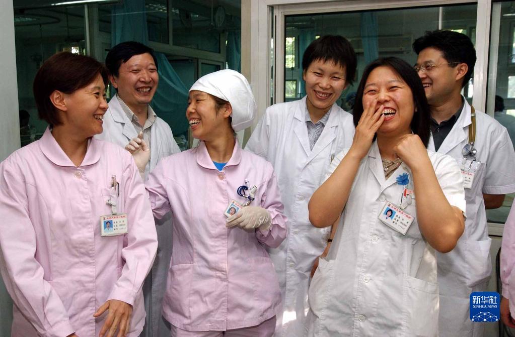 2003年6月24日,北京大學(xué)第一醫(yī)院呼吸科重癥監(jiān)護(hù)病房的醫(yī)護(hù)人員聽到世衛(wèi)組織對(duì)北京“雙解除”的消息后,露出勝利的笑容。當(dāng)日,世界衛(wèi)生組織取消對(duì)北京地區(qū)的旅行警告,同時(shí)將北京從有疫情傳播地區(qū)的名單上去除。新華社記者 王呈選 攝