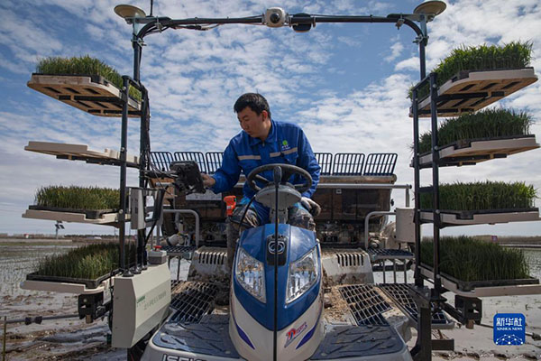 在北大荒集團(tuán)紅衛(wèi)農(nóng)場(chǎng)有限公司智慧農(nóng)業(yè)先行示范區(qū)內(nèi),工作人員設(shè)置無(wú)人駕駛插秧機(jī)工作路徑(2021年5月11日攝)。新華社記者 張濤 攝