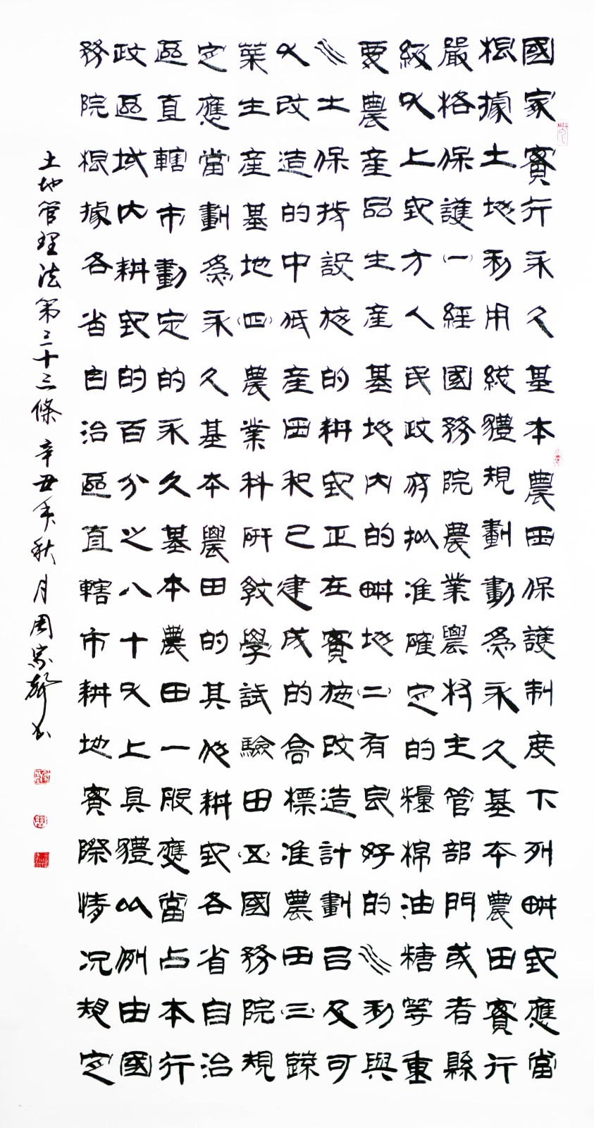 繼1600余位書法家參與書寫《中華人民共和國民法典》全部1260條法條之后,法治日報社聯(lián)合自然資源部法規(guī)司、自然資源部書畫研究會和北京昌平書法家協(xié)會,將筆端對準(zhǔn)土地管理“一法一條例”,即《中華人民共和國土地管理法》和《中華人民共和國土地管理法實(shí)施條例》。