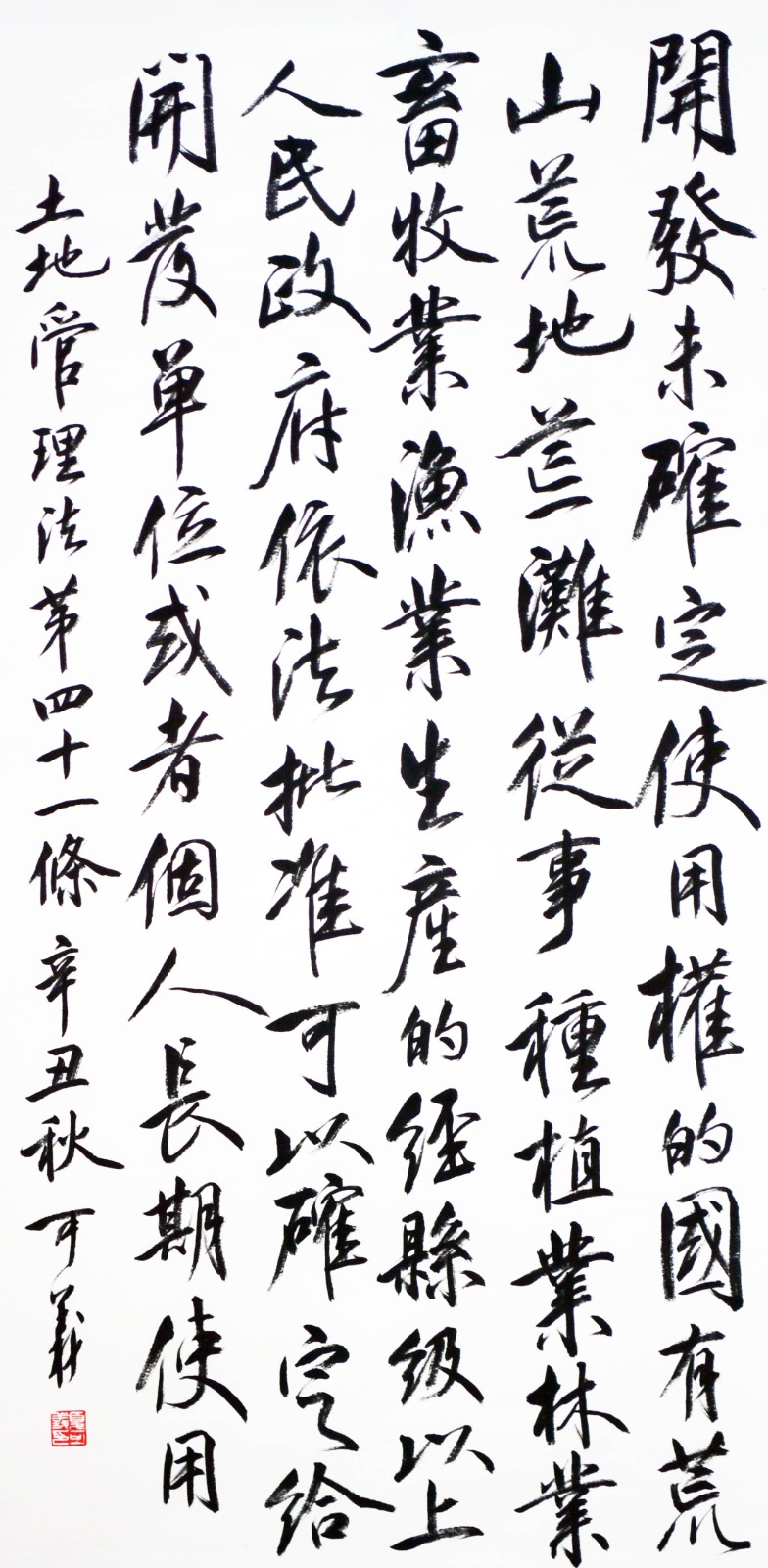 繼1600余位書法家參與書寫《中華人民共和國(guó)民法典》全部1260條法條之后,法治日?qǐng)?bào)社聯(lián)合自然資源部法規(guī)司、自然資源部書畫研究會(huì)和北京昌平書法家協(xié)會(huì),將筆端對(duì)準(zhǔn)土地管理“一法一條例”,即《中華人民共和國(guó)土地管理法》和《中華人民共和國(guó)土地管理法實(shí)施條例》。