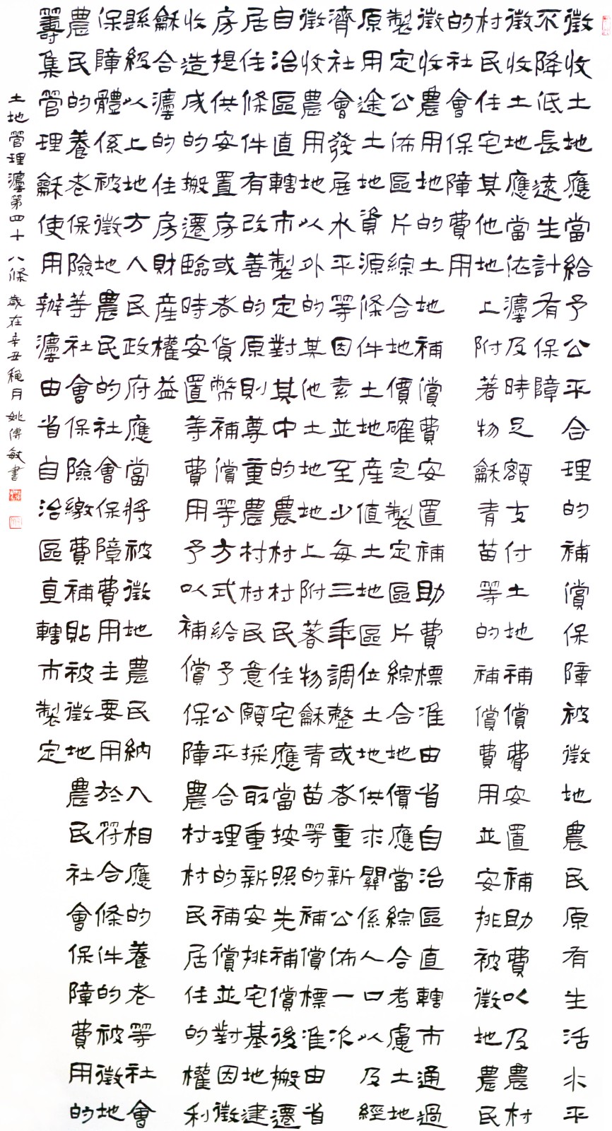 繼1600余位書法家參與書寫《中華人民共和國民法典》全部1260條法條之后,法治日報(bào)社聯(lián)合自然資源部法規(guī)司、自然資源部書畫研究會(huì)和北京昌平書法家協(xié)會(huì),將筆端對準(zhǔn)土地管理“一法一條例”,即《中華人民共和國土地管理法》和《中華人民共和國土地管理法實(shí)施條例》。