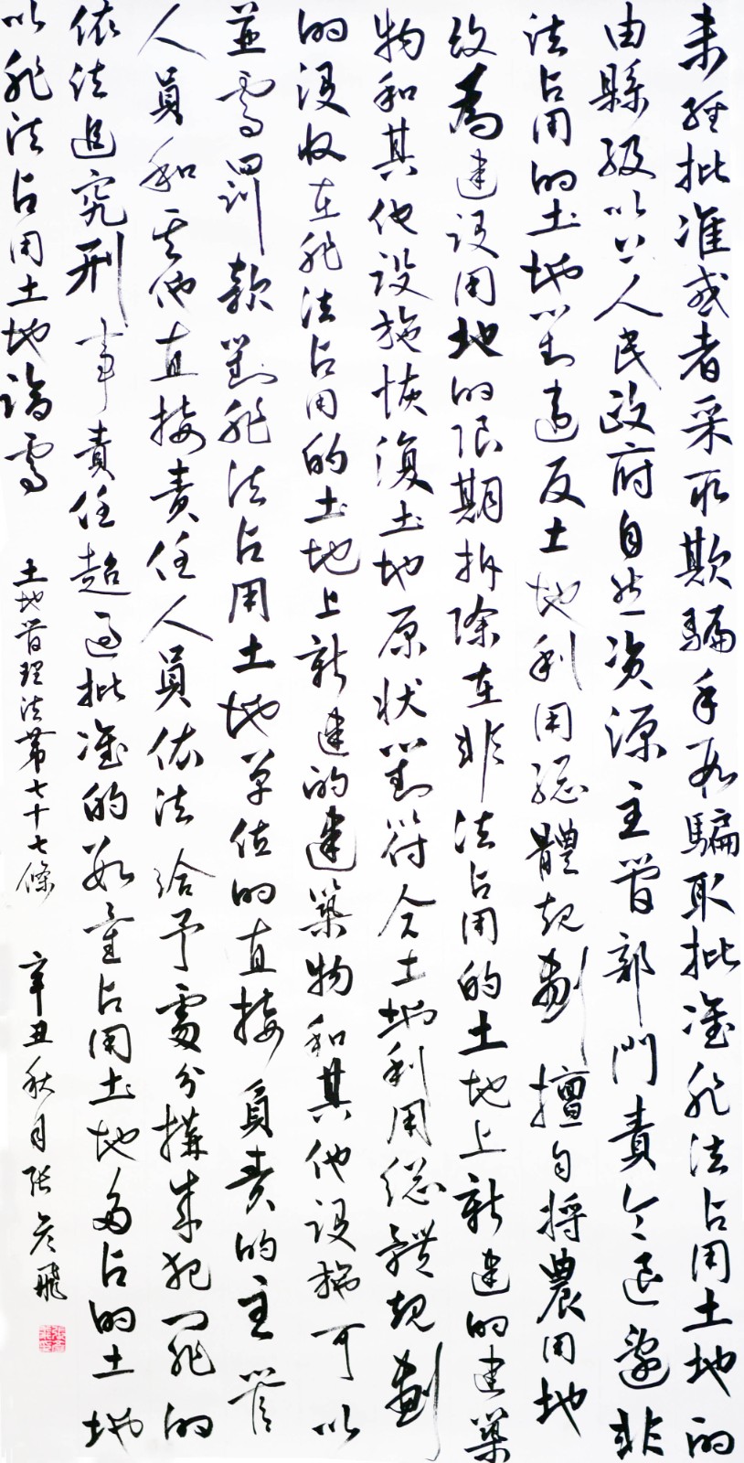 繼1600余位書法家參與書寫《中華人民共和國民法典》全部1260條法條之后,法治日報社聯(lián)合自然資源部法規(guī)司、自然資源部書畫研究會和北京昌平書法家協(xié)會,將筆端對準土地管理“一法一條例”,即《中華人民共和國土地管理法》和《中華人民共和國土地管理法實施條例》。