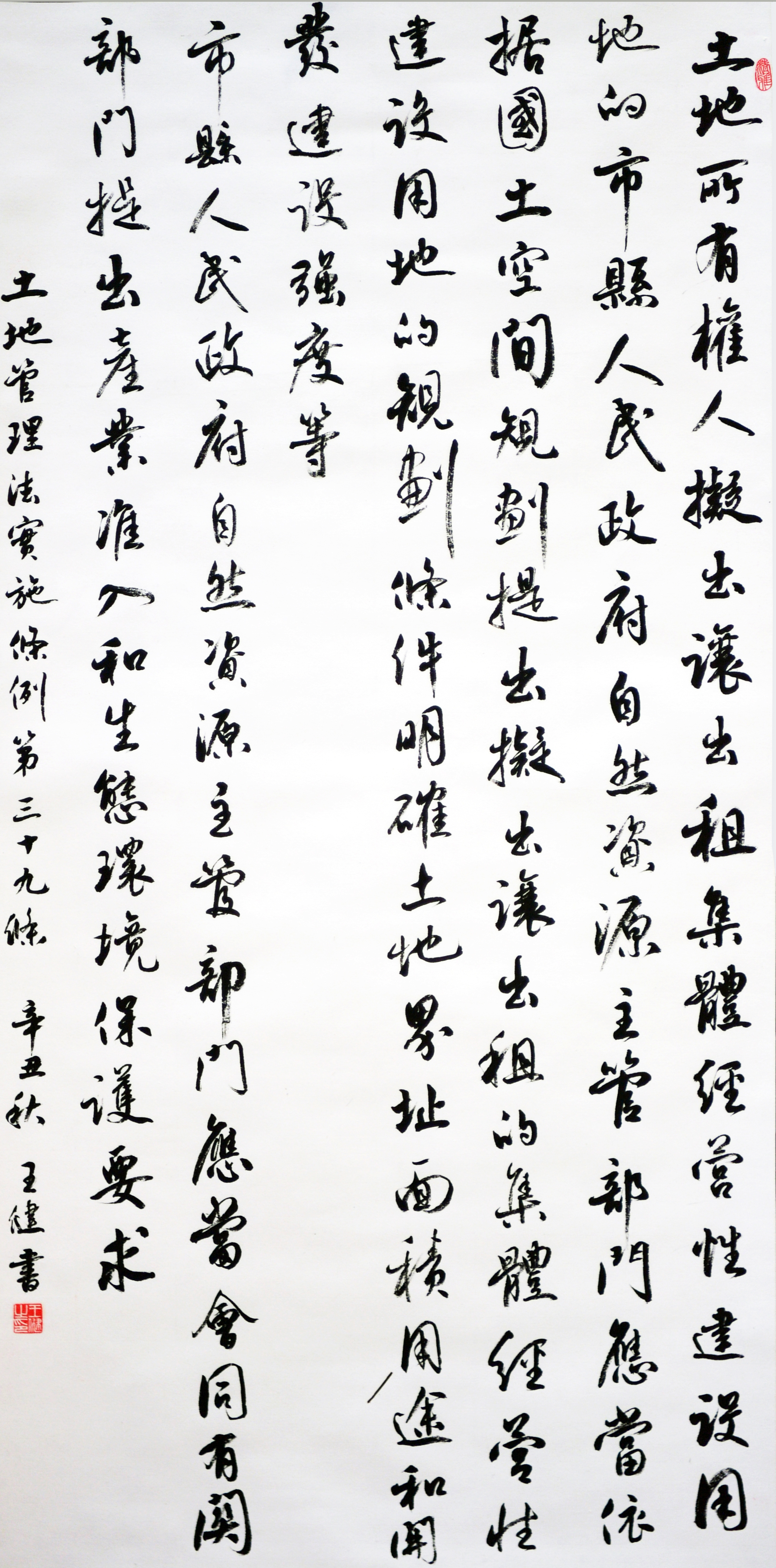 繼1600余位書法家參與書寫《中華人民共和國民法典》全部1260條法條之后,法治日?qǐng)?bào)社聯(lián)合自然資源部法規(guī)司、自然資源部書畫研究會(huì)和北京昌平書法家協(xié)會(huì),將筆端對(duì)準(zhǔn)土地管理“一法一條例”,即《中華人民共和國土地管理法》和《中華人民共和國土地管理法實(shí)施條例》。