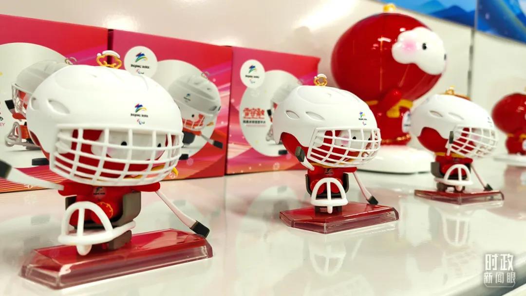 △冬奧村特許商品零售店內(nèi),冬殘奧會(huì)吉祥物“雪容融”冰球運(yùn)動(dòng)文創(chuàng)產(chǎn)品亮相。(總臺(tái)央視記者鐘鋒拍攝)