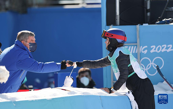 2月8日,國(guó)際奧委會(huì)主席巴赫(左)向中國(guó)選手谷愛(ài)凌表示祝賀。