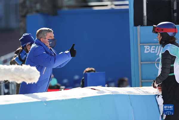 2月8日,國(guó)際奧委會(huì)主席巴赫(左)向中國(guó)選手谷愛(ài)凌表達(dá)祝賀。