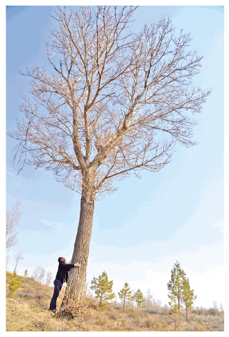 郭建軍環(huán)抱著林場里第一株成活的大樹。 白凌燕 攝