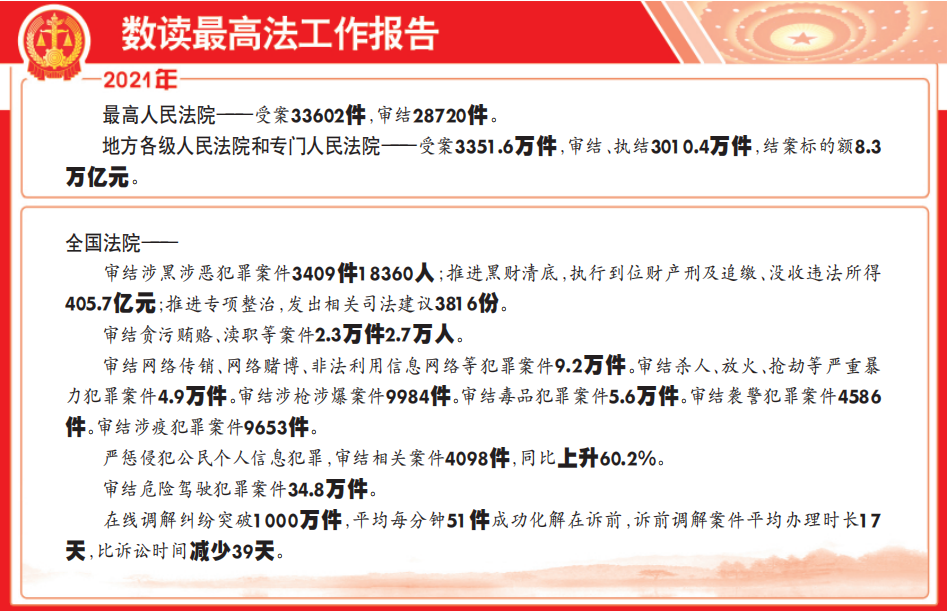 【報告摘要】認(rèn)真貫徹黨中央司法改革部署,堅持體制改革和科技創(chuàng)新雙輪驅(qū)動,一仗接著一仗打,一個難題接著一個難題攻克,讓公平正義成為新時代人民司法的鮮亮底色。2021年,全國法官人均辦案238件,一審服判息訴率88.7%,二審后達(dá)到98%,長期未結(jié)訴訟案件同比減少16.3%,在案件壓力增大情況下,審判質(zhì)效指標(biāo)持續(xù)穩(wěn)中向好,人民群眾對司法公正的獲得感不斷增強(qiáng)。