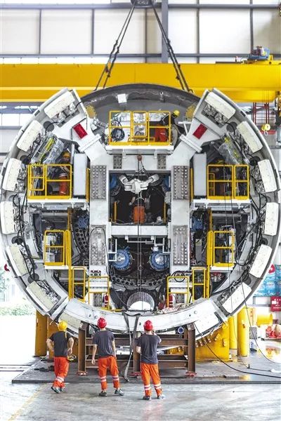 廣東省佛山市順德區(qū),在中鐵華隧聯(lián)合重型裝備有限公司生產車間內,工人正在組裝盾構主機。