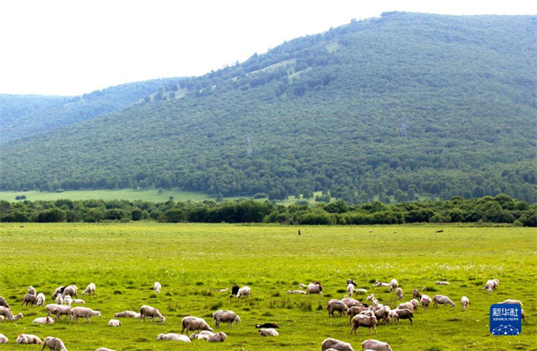 2021年7月15日,羊群在內(nèi)蒙古錫林郭勒盟東烏珠穆沁旗的草原上悠閑覓食。新華社記者彭源攝