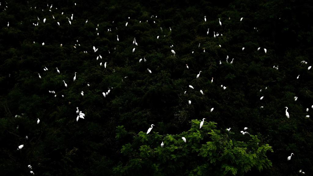 在江蘇省大豐麋鹿國家級(jí)自然保護(hù)區(qū),大量白鷺在樹頂棲息。(無人機(jī)拍攝)新華社記者李響攝
