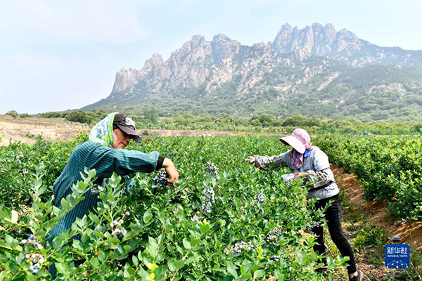 村民在山東省五蓮縣九五農業(yè)現代林果科技產業(yè)園采摘藍莓(2022年6月18日攝)。新華社記者 郭緒雷 攝