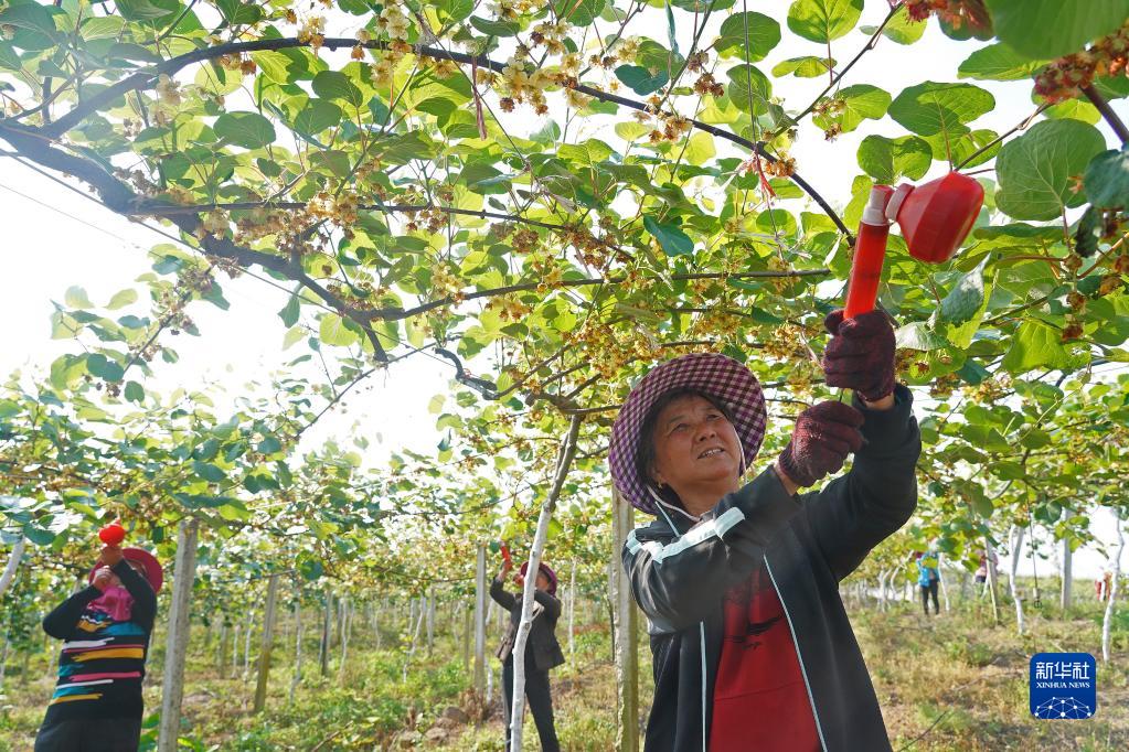在位于江西宜春市奉新縣赤岸鎮(zhèn)城下村的“初心園”獼猴桃產(chǎn)業(yè)扶貧基地,村民為獼猴桃果樹進(jìn)行人工授粉(2020年4月29日攝)。新華社記者 萬象 攝