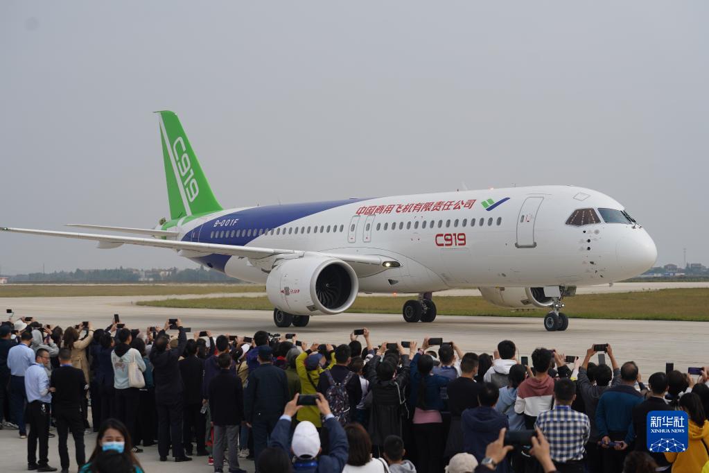在2020南昌飛行大會(huì)上,國產(chǎn)大飛機(jī)C919亮相江西南昌瑤湖機(jī)場(chǎng)并進(jìn)行飛行表演(2020年10月31日攝)。新華社記者 周密 攝