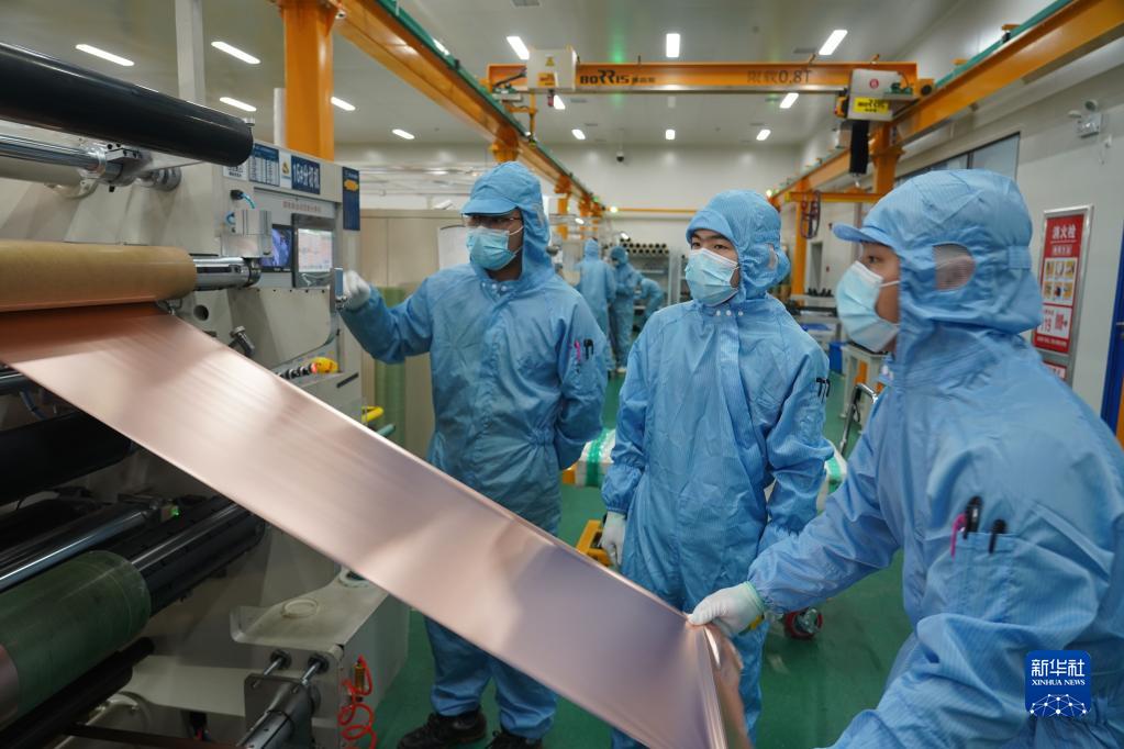 在位于江西南昌高新區(qū)的江銅耶茲銅箔有限公司,工人進(jìn)行鋰電銅箔分切工序(2022年5月12日攝)。新華社記者 周密 攝