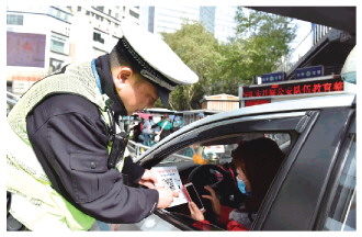 為提升嚴(yán)格規(guī)范公正文明執(zhí)法的能力水平,四川省綿陽市公安局交警支隊(duì)啟動“民警執(zhí)法服務(wù)評價系統(tǒng)”。圖為2021年3月22日,民警向駕駛?cè)私榻B評價系統(tǒng)的使用方法。 本報(bào)通訊員 張悅 攝