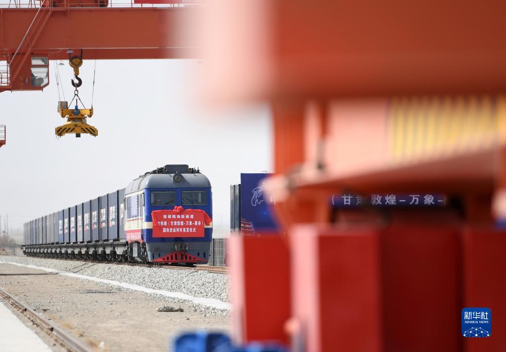 2022年4月21日,甘肅首趟中老鐵路國際貨運(yùn)列車在敦煌市鐵路西貨站綜合貨場(chǎng)等待發(fā)車。新華社記者 陳斌 攝