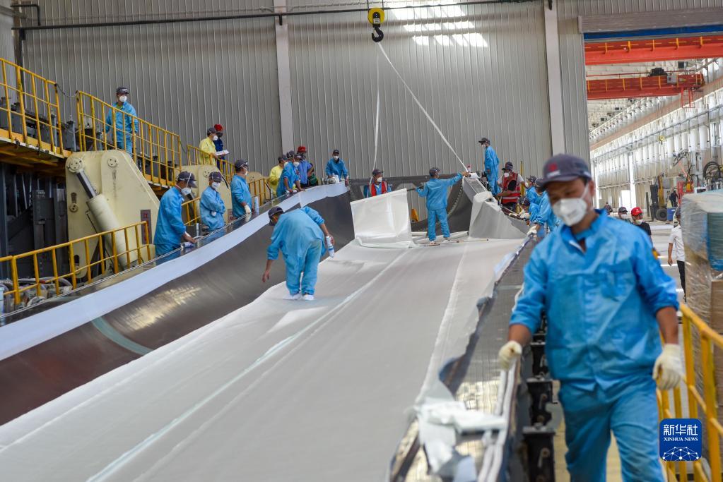 新疆生產(chǎn)建設(shè)兵團(tuán)新星經(jīng)濟(jì)技術(shù)開(kāi)發(fā)區(qū)一家風(fēng)電葉片企業(yè)的員工在車間忙碌(2022年7月27日攝)。新華社記者 丁磊 攝