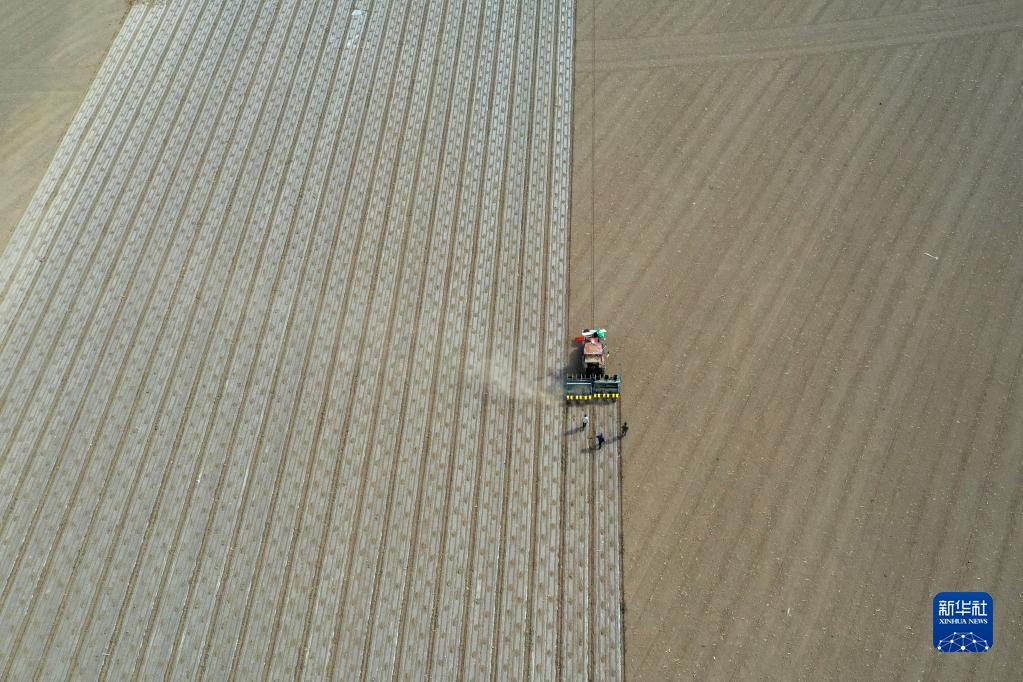 在新疆生產(chǎn)建設(shè)兵團(tuán)第六師共青團(tuán)農(nóng)場(chǎng)的棉田里,職工操作搭載北斗導(dǎo)航系統(tǒng)的播種機(jī)進(jìn)行春播(2022年4月19日攝,無(wú)人機(jī)照片)。新華社記者 丁磊 攝