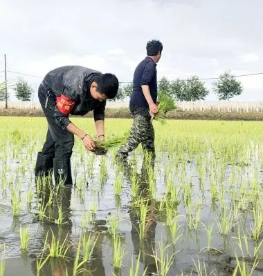 圖為6月6日,黑龍江省大慶市肇源縣肇源鎮(zhèn)四方山村網(wǎng)格員幫助殘疾戶補插秧苗。 李友亮 攝