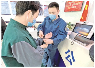 圖為北京市海淀公安分局執(zhí)法辦案管理中心的工作人員為犯罪嫌疑人佩戴手環(huán)。